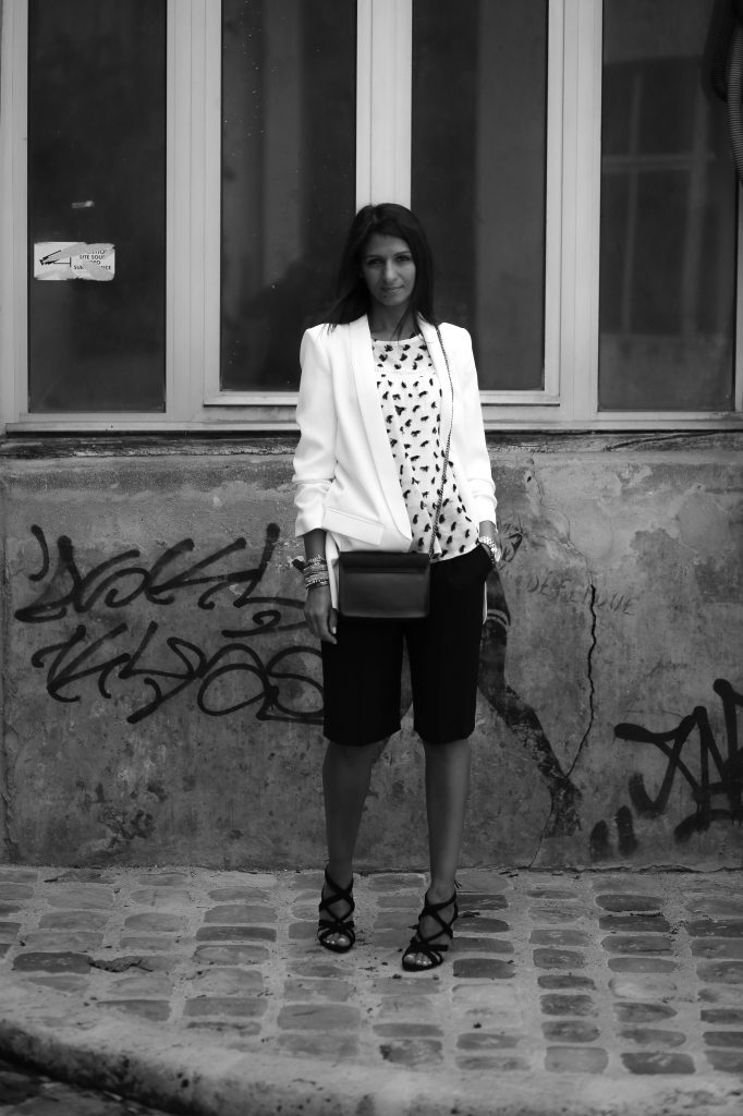 Pour ce look esprit « working girl », je voulais sortir du traditionnel tailleur pantalon ou jupe crayon. Je suis partie sur un bermuda fluide, j’ai joué sur les coupes et le noir et blanc pour garder un côté moderne.